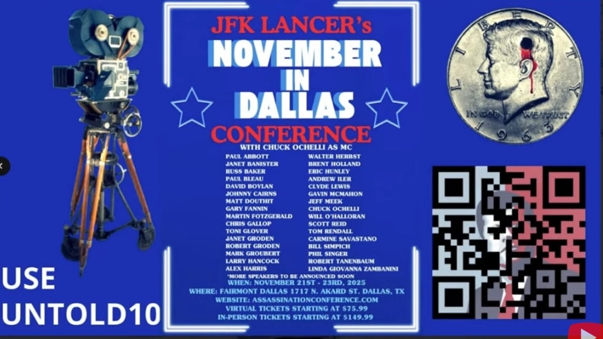 Join Eric Hunley and Mark Groubert November 21st–23rd, 2025, in Dallas at JFK Lancer Conference (or Virtually). Tickets are now available at https://assassinationconference.com
